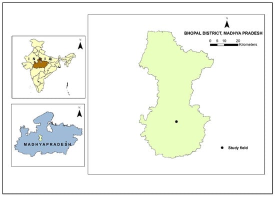 The experiment was carried out in 2018 at the research farm of Indian Council of Agricultural Research (ICAR)-Indian Institute of Soil Science, Bhopal, India (23°18′ N, 77°24′ E, 485 m elevation) (Figure 1). The experimental site has a sub-humid tropical climate. The study region receives on average of 1080 mm with a mean air temperature of 25 °C. The soil of the study site is classified as a deep clayey vertisol (vertisol, Isohyperthemic, Typic Haplustert). Initial soil characteristics of the study site during 2011 are given in Table 1. Soil of the study site was characterized with neutral to alkaline (pH 7.9) in soil reaction, low electrical conductivity 0.14 dS m−1, and clay in texture. The soil was characterized as low, low to medium and high status in available nitrogen (N), phosphorus (P) and potassium (K), respectively, whereas SOC was characterized as low to medium status. It was observed that major available nutrients decreased with increasing soil depth.