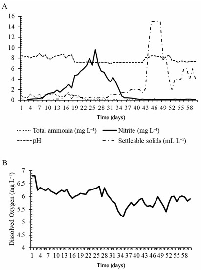In Phase 1, total ammonia, nitrite, pH, settleable solids, temperature, and dissolved oxygen were monitored daily, while nitrate was measured on days 25 and 60. In Phase 2, pH, settleable solids, temperature, and dissolved oxygen were monitored daily; total ammonia and nitrite, three times a week; and nitrate, at the beginning and at days 30 and 60. Total ammonia (TAN) [46], nitrite (N-NO2−) [47], and nitrate (N-NO3−) [48]; pH; temperature; and dissolved oxygen (DO) (model 550A YSI multiparameter—Ohio, USA) were monitored from microcosms in quadruplicate (four water samples), while settleable solids (SS) [8,49] (during 15 min) and alkalinity (ALPHA, 2012) were monitored from the macrocosm in duplicate.