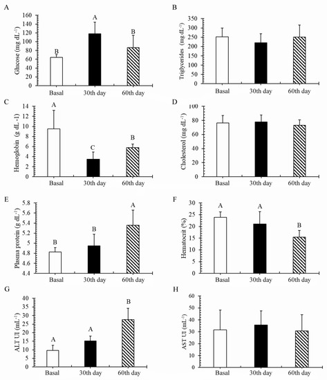 Hematological, biochemical, and enzymatic blood parameters of the Colossoma macropomum juveniles (n = 12 pre collection) on days 0 (basal), 30, and 60 of rearing under biofloc maturation. Different letters on the bars indicate significant differences over time in glucose (A), cholesterol (D), plasmatic protein (E), hemoglobin (C), and ALT (G) according to Kruskal–Wallis test (p < 0.05). Different letters on the bars indicate significant differences over time in AST (H), triglycerides (B), and hematocrit (F), according to Tukey´s test (p < 0.05).