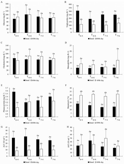 Blood parameters (basal and on day 60, Phase I) for Colossoma macropomum juveniles under different feeding frequencies and feeding rates: glucose (A), triglycerides (B), cholesterol (C), hemoglobin (D), plasmatic protein (E), hematocrit (F), ALT (G), and AST (H). Capital letters indicate significant differences between feeding regimes (treatments); lowercase letters indicate significant differences over time (between basal and day 60). Two-way ANOVA, Tukey’s test (p < 0.05).