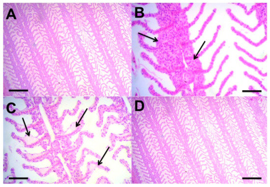Histological analysis revealed hyperplasia for all treatments, all of them were classified as light to moderate (Figure 4B, T7 × 4). Epithelial lifting (Figure 4C, T6 × 6) and lamellar fusion also were observed. In general, all treatments exhibited normal predominances of primary and secondary lamellae (Figure 4A,D, T6 × 4 and T7 × 6).