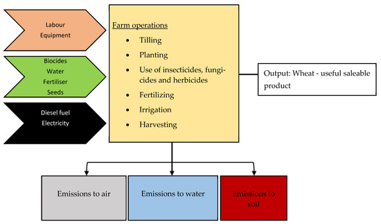 The wheat cultivation system analysed in this paper is depicted in Figure 1. The processes include irrigation, fertilisation, pesticide-spraying, and harvesting. The outflows for the E-LCA are wheat, straw, and the direct emissions to the environmental media associated with material and energy use. The output for the DEA is just wheat. Figure 2 represents the 5-step LCA + DEA approach adopted for this analysis [29,39], and it includes: