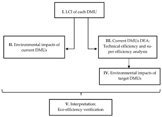 - Environmental life cycle impact assessment (LCIA) for the environmental characterization of each DMU.