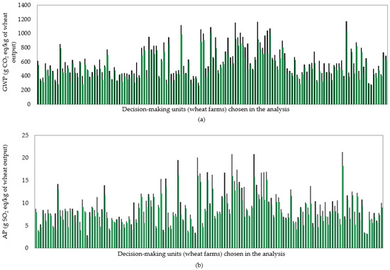 The target operating inputs (courtesy the DEA in the fourth step) led to new LCIAs involving the modified LCI data for the inefficient farms. Subsequently, a new environmental characterization was computed for these inefficient farms, under an efficient-operation scenario. Figure 3 and Figure 4 chart the environmental impacts per kg of wheat output of the original inefficient DMUs and their distribution vis-à-vis those associated with their virtual targets. As seen, and quite obviously, the environmental impacts in these ‘virtual targets’ are lower than those in the original DMUs, thanks to the optimization of the operational inputs. Figure 5 graphically shows the average reduction in the environmental impacts for the four environmental impact categories considered in this analysis. The reductions are 11% each for GWP and EP, and 14% and 15%, respectively, for AP and NRE.