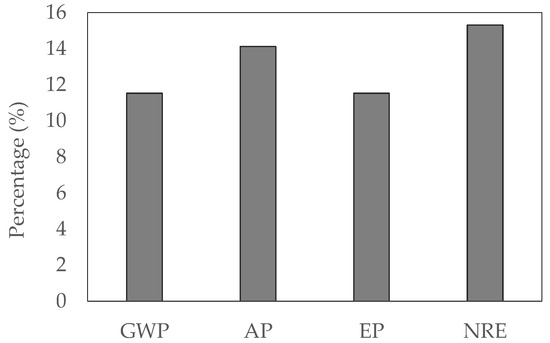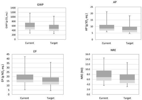 Average possible reductions for GWP (Global Warming Potential), AP (Acidification Potential), EP (Eutrophication Potential), and NRE (Non-Renewable Energy) use for the inefficient DMUs.