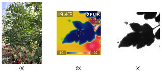 Images of a tomato plant and leaf: (a) leaves exposed to incoming solar radiation at multiple sections of a plant and different directions, (b) thermal image, (c) processed thermal image.