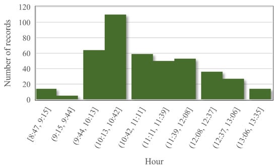 Each column in Figure 2 represents the total number of records obtained in the three greenhouses from both growing seasons. As shown in Figure 2, most images were captured between 10:13 and 10:42, with later images captured until 13:00 p.m.