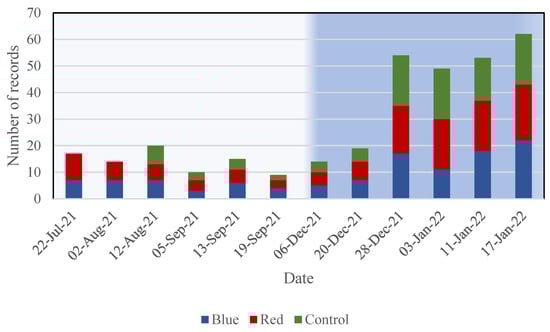 Number of records per day, divided stacked by greenhouse. Data of summer and winter growing seasons, from 22 July to 19 September 2021 (light blue background) and 6 December 2021 to 17 January 2022 (darker background), respectively.
