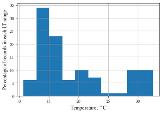 The size of the training and test data sets make a major contribution to a model’s accuracy, but the data distribution in the temperature range also affects the accuracy. The segmentation into training and test subsets was conducted by shuffling the data and dividing them according to desired subsets ratios. Figure 4 shows the histogram of the resulting test data set, divided into 10 equal-width columns of about 1.7 degrees each in the range of 10.75–32.53 °C.