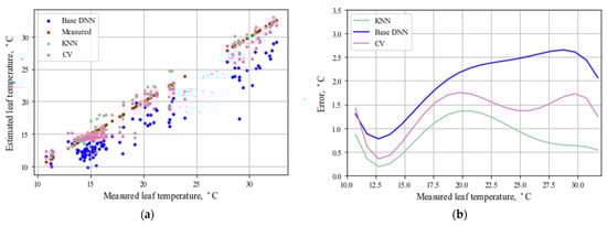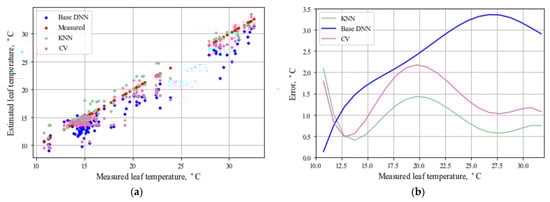 Using high-correlated features: (a) KNN, BASE, and CV leaf temperature predictions versus the measured values; and (b) each model error as a function of the measured values.