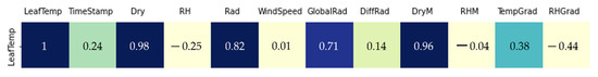 Figure 6 shows the Pearson linear correlation between the values of each feature and the leaf temperature value. A darker color represents a higher correlation. This figure shows that the radiation, dry temperature, and vertical temperature gradients inside the greenhouses and the dry temperature and global radiation measured by the meteorological station have a high correlation, or impact, on the leaf temperature with a correlation coefficient higher than 0.7. Since it is common to use as few features as possible, especially for relatively small databases, each model was evaluated with the highly correlated features only. Since linear correlation was evaluated, the negative correlation factor indicates features that tend to move in an opposite direction to LT.