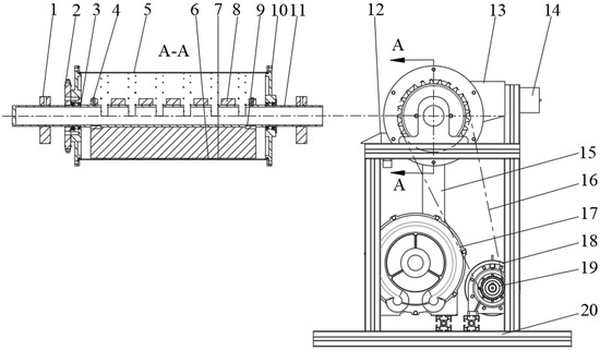 Schematic diagram of the air-absorbing staggered roller type precision seed discharger structure. 1. Fixed support; 2. Large sprocket; 3. Bearing; 4. Fastening screw; 5. Drum; 6. Absolute pressure block; 7. Spring; 8. Inner drum; 9. Standard flat key; 10. End cover; 11. Negative pressure shaft; 12. Seed thrower; 13. Seedbox; 14. Bin wall vibrator; 15. Steel wire hose; 16. Chain; 17. Whirlpool fan; 18. Reducer motor; 19. Small sprocket; 20. Machine frame. A-A. The cross-sectional view of the seeding drum.