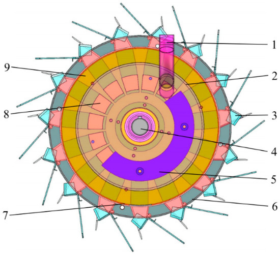 Structure diagram of the hole sower. 1. Seed guide; 2. Fixed disc; 3. Duckbill; 4. Shaft; 5. Seed guard; 6. Moving disc; 7. Retaining ring; 8. Seed divider; 9. Seed stopper.