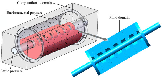 The flow field simulation sets the outer surface of the drum as the ambient pressure inlet, and the negative pressure shaft outlet as the static pressure outlet, the simplified model is shown in Figure 4 [26,27,28]. The negative pressure value is the difference between ambient and static pressure; the ambient pressure is the standard atmospheric pressure, 101,325 Pa.