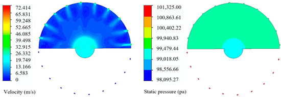 The negative pressure inside the roller and the roller type aperture affect the seed filling effect. In order to find a certain rule, the pressure and velocity clouds were obtained under the conditions of 3.5 mm aperture and 2.43 kPa negative pressure, as shown in Figure 5 and Figure 6.