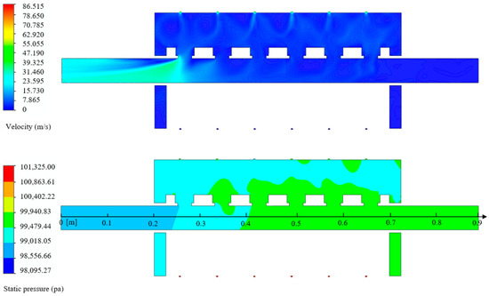 Figure 5 shows the section nearest to the exit end of the negative pressure shaft, which has 20 holes. As the fluid domain is only in the upper part of the drum, the holes are numbered clockwise 1–10 in the upper part of the pressure cloud to facilitate the comparison of subsequent simulation results. As can be seen from the velocity cloud diagram of the longitudinal section, the velocity is higher near the negative pressure axis and the typed hole. The airflow velocity is lower at the rest of the locations. The type holes are evenly distributed along the circumference of the drum, and the radial velocity gradient changes significantly. Vortices are easily formed between the holes in the vicinity of the drum wall, but the holes are not easily affected by vortices. The closer the distance to the shaft, the higher the negative pressure value, and the further away from the negative pressure value, the lower the value. By comparing the airflow velocity at the exact position of the holes at different cross-sections, it is found that the difference in velocity is not apparent, and the velocity distribution clouds at the nearest and farthest sections from the outlet are the same as the pressure distribution clouds.