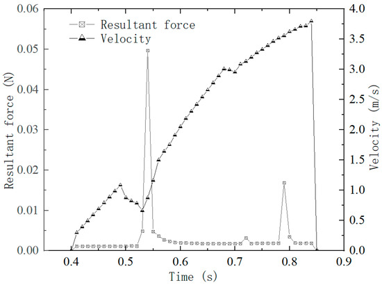 The total simulation time is 2 s, 10 particles are generated per second, the interval time is the same, and at most one particle is generated each time. Figure 9 shows the selected No. 4 cotton seed particles, that is, the fourth cotton seed generated in the simulation process, and analyzes its moving speed and force in the seed pipe. The force of cotton seeds in the seed pipe is a comprehensive effect, including gravity, air resistance, airflow force, support force when colliding with the seed pipe, rolling friction, sliding friction, and so on. The comprehensive force of the cotton seed in the vertical pipe is about 0.0011 N, and the comprehensive force of the cotton seed is about 0.0018 N in the mixing area of the cotton seed and the air flow in the seed feeding pipe. After the cotton seeds are formed, the initial speed of downward movement is 0.2 m/s, and then, the vertical pipe section accelerates, and the speed fluctuates in the flaring area. After that, the speed increases sharply under the action of the comprehensive external force, and the speed reaches the maximum value at the exit.