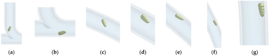 Movement state of cotton seeds at special moments. (a) t = 0.49 s; (b) t = 0.54 s; (c) t = 0.68 s; (d) t = 0.69 s; (e) t = 0.72 s; (f) t = 0.79 s; (g) t = 0.84 s.