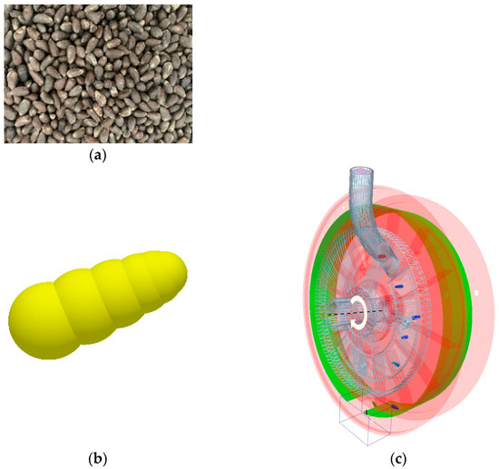 The construction of discrete element particles is essential in the simulation. It is important to create similar models with a high degree of similarity in size and shape to bring the simulation results closer to reality. The actual cotton seed is shown in Figure 11a. The lint-free cotton seed is an ellipsoid at one end and a cone at the other. The seed model is created using the Creator module in EDEM software, (EDEM Academic 2018, DEM Solutions Limited, Edinburgh, UK) and seven spheres are aggregated into one seed using the spherical aggregation method, as shown in Figure 11b. A 3D model of the cavity seeder was created in Solidworks. The hole sower model was simplified by removing the duckbill and non-essential parts, saving it as a STEP file and importing it into EDEM, as shown in Figure 11c.