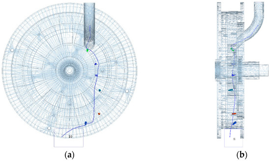 In order to understand how the seeds move inside the hole sower, the Analyst module was selected in EDEM, and Manual Selection was added to Set up; the cross cursor was used to select seed number 10 as the object of study in the model and Stream All Steps was checked to show the entire trajectory curve, as shown in Figure 12 [36]. If the seeds enter the seed guide smoothly, the seeds are first positioned close to the inner ring of the seed compartment when the compartment carrying the seeds is rotated from above to horizontal; when the compartment carrying the seeds is rotated from horizontal to below, the seeds move along the side plate of the compartment from the inner ring to the outer ring; the seeds moving to the outer ring collide with the retaining ring and are then carried by the side plate on the other side of the compartment to the gap in the retaining ring. The side plate then carries the seed on the other side of the divider to the gap in the retaining ring [37].