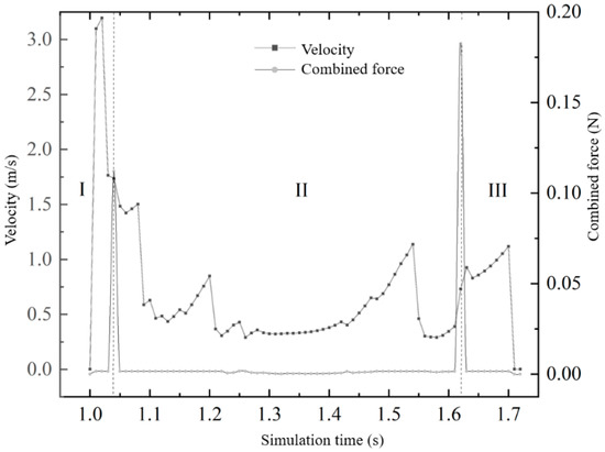 The whole process from seed generation to discharge is shown in Figure 13, divided into three stages: seed drop zone I, seed follow zone II, and seed discharge zone III. The interval 1–1.04 s is the first stage. Since the initial speed of the generated seeds is set to be fast, the seeds are only under the action of gravity (0.0016 N), and quickly enter the hole seeder through the seed guide port, and the seeds collide violently with the bottom plate of the seeding grid. After that, the speed decreased sharply, from 3.1 m/s to 1.7 m/s and then to 0.6 m/s, and the resultant force was 0.11 N, which showed a sudden state in the figure. The interval 1.05–1.61 s is the second stage, the seed speed is at a low level, when the seeding disc rotates from the top to the horizontal, the seeds collide and rub slightly with the side plate of the seeding grid, and the speed increases slightly and then decreases, so the resultant force fluctuates slightly at this stage, and the speed of the seeds in the seeding grid gradually increases to 1.1 m/s when the seeding disc rotates from the horizontal to the bottom, and decreases to 0.3 m/s when it reaches the bottom. The interval 1.61–1.7 s is the third stage. At this time, the speed is at a low level. The seeds are accelerated to 0.9 m/s by the side plate of the sorting grid, and the resultant force is 0.18 N, and the seeds are discharged from the gap of the retaining ring. After the seeds are separated from the hole seeder, they are accelerated to 1.11 m/s under the action of gravity, and the seeding trajectory is similar to the horizontal throwing motion.