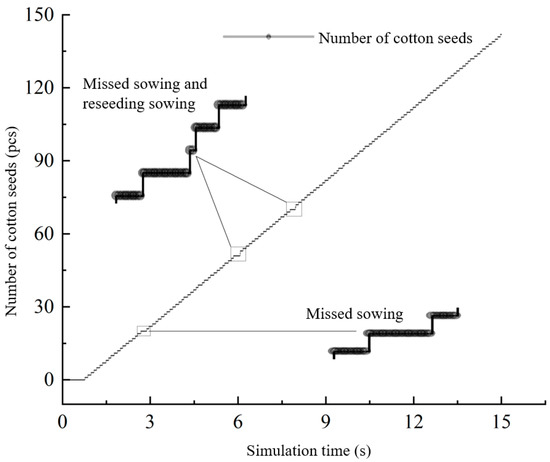 As shown in Figure 15, the graph is a horizontal line at 0–0.76 s, at this time, no seeds have entered the gap of the retaining ring, and the number of seeds discharged after that increases along a linear step. During the simulation process, the speed of the hole seeder is constant, which means that the time for each sub-grid to pass through the gap area is the same. Further analysis of the partial enlarged image shows that the short horizontal line rises after that, indicating that single cotton seeds are discharged from the sorting grid within this time range; the long horizontal line rises after that, indicating that no seeds are discharged from the gap in the sorting grid within this time range. At this time, the phenomenon of missing seeding occurs; after the long horizontal line, it jumps up in a short time, indicating that no seeds are discharged from the previous sub-seed grid within the time range, and more than one seed is discharged from the gap in the latter sub-seed grid, and reseeding occurs at this time. In the figure, there is only a missed broadcast at 2.78 s, and at 6 s and 7.9 s, both missed broadcasts and replays occur, and the rest of the time is qualified. Based on this, the seeding performance can be accurately described, and the missed seeding index, qualified index, and replaying index under various simulation conditions can be obtained.