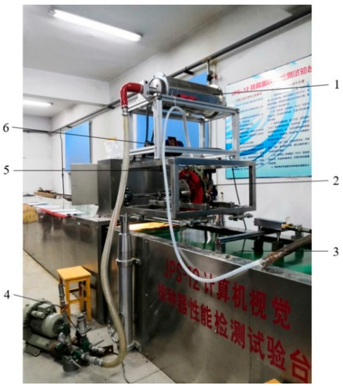 Bench test of a split seeding system. 1. Seed discharger; 2. Hole sower; 3. Seed belt; 4. High-pressure whirlwind fans; 5. Positive pressure seed delivery tubes; 6. Gear motor.