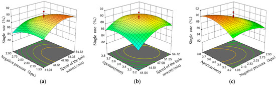 Effect of interaction factors on single grain rate. (a) Effect of hole sower speed and negative pressure on seed rate; (b) Effect of hole sower speed and aperture size on seed rate; (c) Effect of negative pressure and aperture size on the seed rate.