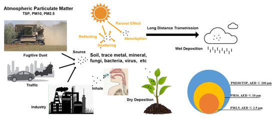 | Impact on the Environment | Absorb or scatter sunlight, reduce atmospheric visibility, weaken solar radiation, affect environmental thermal balance, long distance transmission, deposition, parasol effect, greenhouse effect. | [55,56,57,58,59,60,61] |