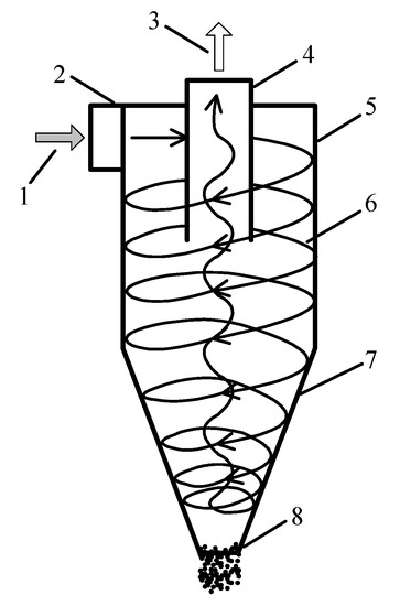 - Cortes, C.; Gil, A. Modeling the gas and particle flow inside cyclone separators. Prog. Energy Combust. Sci. 2007, 33, 409–452. [Google Scholar] [CrossRef]