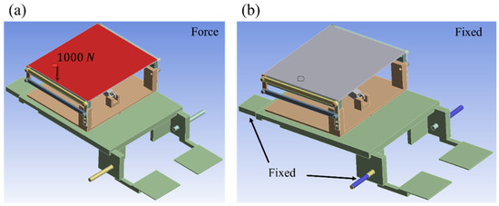 Figure 3 shows the boundary condition, Figure 3a presents the condition for force, and Figure 3b shows the fixed condition. The analysis results for seating and standing modes are shown in Figure 4a,b, respectively. From checking the maximum equivalent stress, the seating mode is 29.584 in the four-bar link, and standing mode is 75.875 for the footrest. This is lower than the 193 yield strength of aluminum 5052 and satisfies the safety factors of 6.52 and 2.54. The deformation and stress values are summarized in Table 3.