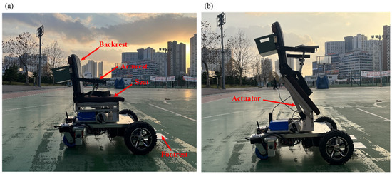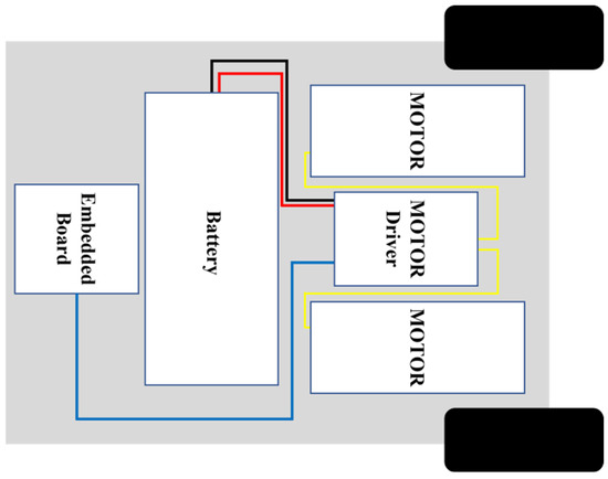 The motor and battery were attached to the lower end of the prototype so it would not be difficult to move. The configuration and wiring attached to the lower end of the prototype is shown in Figure 5. The motor, motor driver, and battery are mounted at the bottom to drive the prototype. The attachment of the lower end is shown in Figure 6. The two motors are attached to the battery and the embedded board via the motor driver. A driver for control was installed according to specifications, and a lithium-ion battery supplies power to the two motors. A cushion-shaped chair was attached to give a sense of stability to the prototype, and a device for autonomous driving was added, as shown in Figure 7 and described in Section 3.2. A prototype based on the design was prepared for experimental verification and is shown in Figure 7. This study calculated the acceleration and constant velocity torque for the drive motor and used a BLDC motor equipped with a reducer, as described in Section 2.1.