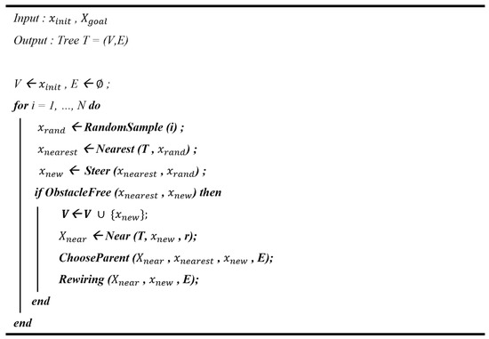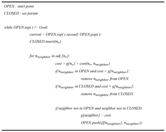 The RRT and A* algorithms for autonomous driving are described in this section. This study determines the shortest path between the beginning and goal places without colliding with any obstacles in order to discover and design the best route. In this investigation, an algorithm was chosen and used. The following is a quick summary of the two algorithms. The A* algorithm first calculates the shortest path from the initial node (beginning point) to the destination node (target point). The operation method of the A* algorithm used in the experiment is shown in Figure 8. The RRT method is a sampling-based path-planning technique that creates points at random locations throughout the state space and utilizes this as a propensity to expand the tree quickly from the beginning point to generate a path that leads to the destination.