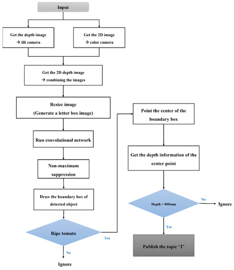 is a heuristic function that estimates the cost of the cheapest path from n to the objective, where is the next node on the path, is the cost of the path from the start node to , and is the cost of the path from the start node to . The RRT method is far faster than the A* algorithm; nevertheless, the RRT algorithm’s computed path is significantly longer than the A* algorithm, which is a significant drawback. The effects of such distance measuring technologies are the subject of ongoing research. Velodyne LiDAR data was translated into 2D laser data using an algorithm to create a map, and trials were undertaken on straight roadways to test the reaction speed. The RRT [11] method first locates a configuration space, then enters an initial configuration state () and a goal configuration state (), selecting any feasible from init and connecting them with edges. The technique is then continued until the target is attained, at which point the best path is created. The operation method of the RRT algorithm used in the experiment is shown in Figure 9 [12]. An experiment was conducted to evaluate the performance of the prototype in an environment with trees. Ripe tomatoes and unprocessed tomatoes were attached to trees to construct an experimental environment. To distinguish tomatoes, the vision camera uses Intel’s RealSense D435 (a 3D camera). After driving the prototype, YOLO v3-Tiny used the learned weight file to detect harvestable tomatoes in an image, distinguishing between harvestable (red and ripe) tomatoes and unripen (green) tomatoes. This system extracted distance information from the center point of the tomato’s boundary box, as detected by the 3D camera. Object recognition and detection was performed using deep learning. The deep learning algorithm used is YOLO v3, plus a deep neural network learning layer and multilayer perceptron (MLP) consisting of an output layer structure and multiple hidden layers [13,14,15]. YOLO v3 has been applied to various types of algorithms such as the recurrent neural network, although YOLO v4 and YOLO v5 were recently released [16,17]. The structure of YOLO is like a region-based convolutional neural network (R-CNN) in that it consists of bounding box classification, positioning, deduplication, and post-processing, but it defines a series of object detection procedures as one regression problem [18,19]. Although these one-stage-detection systems reduce the accuracy, the detection speed (in frames per second) is greatly increased so that the object can be recognized in real time at a rapid detection speed. This has evoked a large wave of cognitive deep learning. According to the trends in artificial-intelligence-related research for the visually impaired, YOLO showed the highest number of uses at 2.7% as an application technology for domestic research design and development implementation, and YOLO v2 showed the accuracy and speed of an R-CNN [20]. The improved Fast R-CNN and the Faster R-CNN showed higher accuracy and speed [21,22]. From the third version of YOLO used in various projects, this study selected and used the Tiny version, which has a slightly lower accuracy but a relatively small memory capacity and a high detection speed.