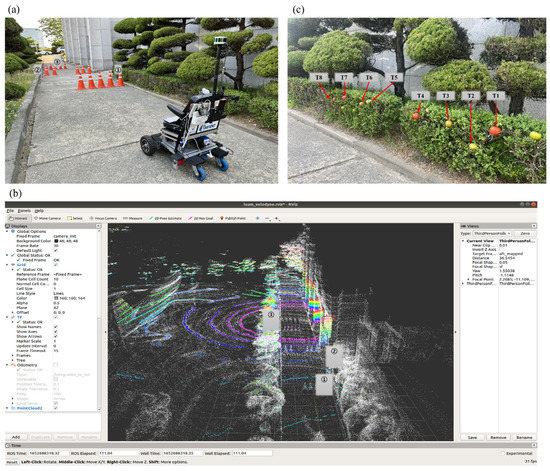 Establishment of the autonomous driving test environment: (a) experimental environment; (b) 3D map collected point cloud; (c) experimental environment for tomato recognition.