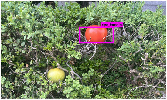 The convolutional network process in Figure 10 populates weight data with the image. Therefore, a pre-trained weight file is needed for the target object. In YOLO training, the larger the number of images in the dataset for each class (the target objects to be detected), and the more diverse the angle and lighting environment, the more accurate the detection will be in various actual environments. In this study, 550 images out of about 900 images from Kaggle’s free tomato dataset, which is a machine learning platform, were selected. To use the selected dataset for training, a bounding box is drawn around the target object to be detected from each image.