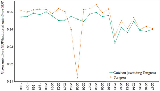 In general, first, the ratio of green agricultural GDP to traditional agricultural GDP in Tongren City and the ratio of green agricultural GDP to traditional agricultural GDP in Guizhou Province (excluding Tongren City) remain at a level of more than 93%, indicating that the development of green agriculture in Tongren City and other cities and states is improving. Second, the ratio of green agricultural GDP to traditional agricultural GDP in Tongren City is slightly higher than that in Guizhou Province (excluding Tongren City), indicating that the output-value share of green agriculture in Tongren City is relatively high in the whole province. Third, it is worth noting that the ratio of green agricultural GDP to traditional agricultural GDP in Tongren City dropped significantly in 2005, which indicates that the ratio of green agriculture GDP to traditional agriculture GDP decreased compared with the previous stage. The possible reasons for this situation are as follows: in order to promote the development of local economy and society, Tongren developed and introduced some industrial projects in the first few years of 2005, which may not well coordinate the relationship between industrial development and green development while promoting economic development. In this way, the development of green agriculture is likely to be adversely affected by the loss of natural resources and pollution of resources and environment. The protection of agricultural resources and environment and sustainable development are restricted, and the ratio of green agricultural GDP has also changed. At the same time, the ratio of green agricultural GDP to traditional agricultural GDP has gradually rebounded in Tongren City since 2011, which shows that Tongren’s municipal Party committee and government have established a concept of green development, promoted green economic and social development and transformation, paid attention to the protection of the environment and the comprehensive utilization of resources, and made a historic leap in its comprehensive strength in promoting the process of urbanization. The comprehensive agricultural production capacity has been improved, and the development of green agriculture has been accelerated. The temporal and spatial variation trend of the ratio of green agricultural GDP to traditional agricultural GDP between Tongren City and Guizhou Province (excluding Tongren City) from 1996 to 2017 are depicted in Figure 1.