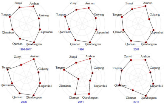 Figure 2 further depicts the temporal and spatial comparison of the ratio of green agricultural GDP to traditional agricultural GDP between Tongren City and other cities and prefectures in Guizhou Province. From each radar chart, the closer the numerical point is to the central point, the smaller the ratio of green agricultural GDP to traditional agricultural GDP; the closer the numerical point is to the edge line, the greater the ratio of green agricultural GDP to traditional agricultural GDP, and the better the development of green agriculture. Compared with the data analysis and presentation from 1996 to 2017, compared with other cities and states, the ratio of green agricultural GDP to traditional agricultural GDP in Tongren is generally higher than that in most cities and states, and has always been among the best, which also means that the development level of green agriculture in Tongren is higher in the whole province, and its demonstration effect and significance of green development and sustainable development play a better role.