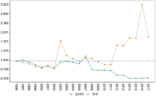 The ranked changes in agricultural GTFP between Tongren City and the other cities of Guizhou Province in 1997 and 2017, respectively, are listed Table 2, which can reflect the spatial and temporal changes of agricultural GTFP in each city over 20 years (1997–2017). It can be clearly seen from Table 2 that the top three agricultural GTFP in 1997 were Qiannan, Tongren, and Qiandongnan, and the bottom three were Zunyi, Liupanshui, and Anshun. In 2017, the top three agricultural GTFP were Liupanshui, Qiannan, and Qianxinan, while the bottom three were Tongren, Zunyi, and Anshun. Obviously, compared with the other seven cities, the agricultural GTFP of Tongren City fell from second place in 1997 to eighth place in 2017, dropping six places. Significant spatiotemporal changes in the agricultural GTFP of Tongren City took place in the 20-year period of 1997–2017.