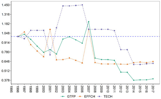 The spatiotemporal evolution of agricultural GTFP and its source decomposition in Tongren City from 1996 to 2017 are charted in Figure 4. From the general trend of change in the chart, the fluctuation range of agricultural GTFP in Tongren City shows obvious differences. From 1997 to 2000, the agricultural GTFP in Tongren City showed a significant downward trend due to the significant decrease in agricultural technology utilization efficiency and the decline of agricultural technology. During 2002–2007, there was a big difference between the agricultural GTFP in Tongren City and the change of agricultural technology utilization efficiency and agricultural-technology progress. During this period, the agricultural GTFP may have been on the rise because of the rapid progress of agricultural technology, and in 2007 the agricultural GTFP reached the highest value. During the period from 2007 to 2017, agricultural GTFP declined due to the retrogression of agricultural technology and the slow growth of agricultural technology utilization efficiency.