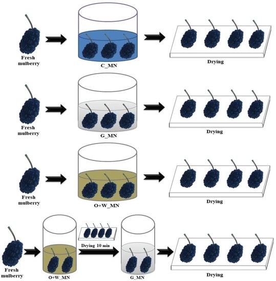 During the growing and ripening periods of the fruit, a number of physical, biochemical and microbiological changes occur [9]. Ripe mulberries have a high moisture content, from 62.20 to 74.62%, and are highly perishable fruits [10]. For this reason, mulberry fruits are at risk of fungal attacks and undergo changes in aroma and appearance after harvest. Thus, an appropriate preservation method is required to maintain all the characteristics of mulberry fruit [11,12,13].