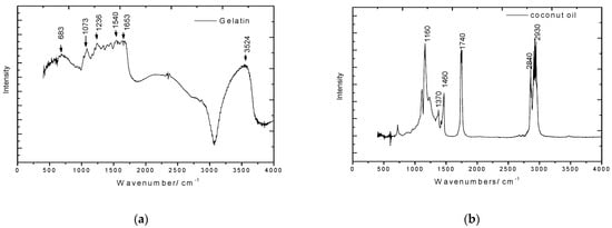 The UV spectrum of gelatine showed two absorptions at 249 nm and 284 nm due to its peptide bond and aromatic groups and side chains, respectively [39]. The absorption spectra of sunflower oil were obtained in the visible range from 300 to 600 nm. The sunflower oil had peaks from carotenoids at 391, 432, 457 and 485 nm, which are the pigments responsible for the oil’s colour. The carotenoids detected in the sunflower oil were lutein and zeaxantin [40]. Crude sunflower seed oil, is a valuable product because it contains higher concentrations of linoleic acid, an essential fatty acid, and is an source of excellent vitamin E. Coconut oil has a high medium-chain fatty acid (caproic (C6), caprylic (C8), capric (C10) and lauric (C12) acids) content that showed weak absorption near 206 nm [41]. Similar results were obtained in [42]. Here, coconut oil from cosmetic cream had maximum UV absorption at the wavelength of 205 nm. The UV spectrum of the beeswax showed absorption at 274 nm, corresponding to the presence of conjugated dienes and trienes. The results are in accordance with [43], where wax from sugarcane peel showed a similar pattern.