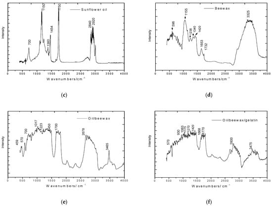 The FTIR fingerprints of sunflower oil (Figure 2c) are: 700 cm−1, corresponding to the rocking vibration of CH2 groups; 1150 cm−1, due to the stretching vibration of C-O; 1360 cm−1, due to CH3 symmetric vibrations; 1454 cm−1, due to CH2 scissoring vibrations; and 1750 cm−1 (the major band), arising from C=O stretching vibrations of aldehydes, ketones and carboxylic acids. In the high region of the wavenumbers, the peaks at 2840 and 2920 cm−1 are due to symmetrical and asymmetrical CH2 vibrations, respectively. The FTIR fingerprints of the beeswax samples were observed as a strong band at around 1155 cm−1, corresponding to C-O asymmetric stretching of esters, and at 1653 and 1732 cm−1, corresponding to C=O stretching in esters and fatty acids, while a large and strong band around 3320 cm−1 can be attributed to O-H stretching vibrations in aliphatic group (symmetric and asymmetric). The hydrocarbon –CH2 in-plane vibration can be observed at around 1420 cm−1 (Figure 2d). Our results are consistent with other studies, both for sunflower oil [52,53] and beeswax [50,54].