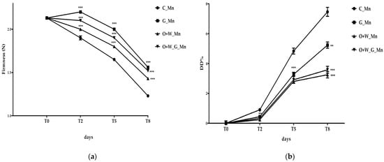 In our study, at 8 days of cold storage (4 °C), the firmness of the coated mulberries was significantly higher than the control (p < 0.001). No significant difference was found between the G_Mn treatment and other treatments (O+W_Mn and O+W_G_Mn) during postharvest storage (p > 0.05). The results suggested that the coatings had a positive effect on maintaining the firmness of the mulberries.