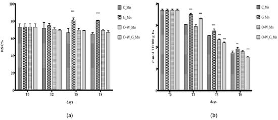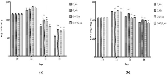 In our study, edible coatings based on gelatine, coconut and sunflower oils and beeswax, as well as combinations of these, were used to preserve the mulberry fruits. Figure 4a,b show the effects of edible coatings on the TPh and MAP content in the mulberries during the storage at 4 °C for 2, 5 and 8 days (T2, T5 and T8). The total phenol content tended to decrease during storage (Figure 4a) in both the control (uncoated) and coated mulberry fruits, which was due to the degradation of anthocyanins and breakdown of the cellular structure during the senescence period [58,61]. The TPh content in mulberry fruits varied both with different coatings and across storage days. A slight increase in phenols after 2 days of storage was observed in all samples, followed by differing trends between samples at 5 and 8 days of cold storage. In the G_Mn and O+W_Mn samples, TPh exhibited a significant increase compared to the control with the same storage time. After 8 days of cold storage (T8), the TPh content was significantly lower compared to the first day of treatment (T0), but all treated samples showed significantly higher amounts of polyphenols compared to the control kept under the same conditions (Figure 4a). A similar trend was obtained in the case of anthocyanins: after 8 days of storage, the amount of MAP in all samples was significantly higher compared to the control (Figure 4b).