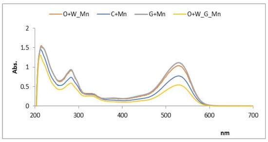 The UV−visible spectra of gelatine, coconut oil and beeswax, dissolved in the proper solvents, were recorded using a Shimadzu PharmaSpec UV-1700 (Shimadzu Corporation, Kyoto 604-8511, Japan) spectrophotometer in the wavelength range from 200 to 300 nm. The wavelength spectrum from 300 to 600 nm was used for sunflower oil. In addition, the UV-Vis spectra of the mulberry samples treated with various edible coatings were recorded on the 8th day after the start of treatment using a Shimadzu PharmaSpec UV-1700 spectrophotometer (Shimadzu Corporation, Kyoto 604-8511, Japan) in the wavelength range from 200 to 700 nm to highlight the presence of anthocyanins and phenolic acids.