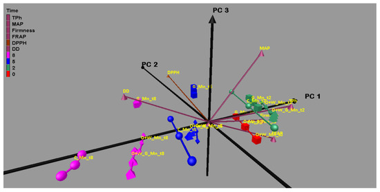Principal component analysis is a widely used statistical method employed to discover the relationships between variables. A PCA plot was applied for the following variables: DD, firmness, TPh, MAP, DPPH and FRAP. The uncoated mulberry (C_Mn) showed different behaviour with respect to storage time compared to the coated samples. Differences between the uncoated and coated fruits with respect to the cold storage period and the different coatings used are shown in a 3D plot (Figure 7). The eigenvalues of the covariance matrix showed that the set of the three principal components (PC1, PC2 and PC3) accounted for 96.16% of the total variance with respect to cold storage in the dataset. PC1 explained 72.326% of the variance, PC 2 explained an additional 14.624% and PC3 explained 9.210%. Different behaviours in the samples were observed at different times during cold storage (0, 2, 5 and 8 days).