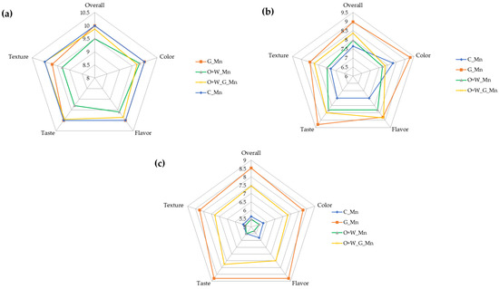 The effects of different treatments on the sensory evaluation of mulberry on T0 (a), T5 (b) and T8 (c) of storage at refrigeration temperature (4 °C).