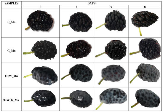 Appearances of the treated (G_Mn; O+W_Mn; O+W_G_Mn) and untreated (C_Mn) mulberry fruits throughout the storage period (8 days) at 4 °C.