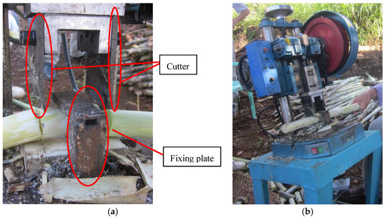 Preparation of sugarcane billets: (a) billet-cutting machine; (b) cutter and fixing plate.